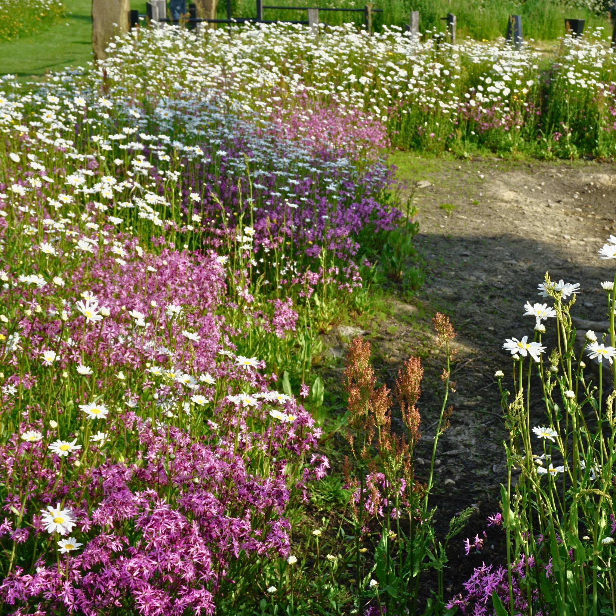 This meadow balances a combination of spring, summer and autumn species, which either thrive or tolerate living in moist and waterlogged soils. Throughout the year, this meadow retains strong form and structure but quickly develops drifts of colour and spikes of drama, as individual species settle and spread in their preferred moist soil conditions. A floriferous designer meadow suitable for the variable moisture levels in rain gardens and damp bio swales. A high percentage of unusual wildflower wetland species from other parts of the globe. 22 different flowering perennial species carefully formulated to create densities of over 150 plants per metre.