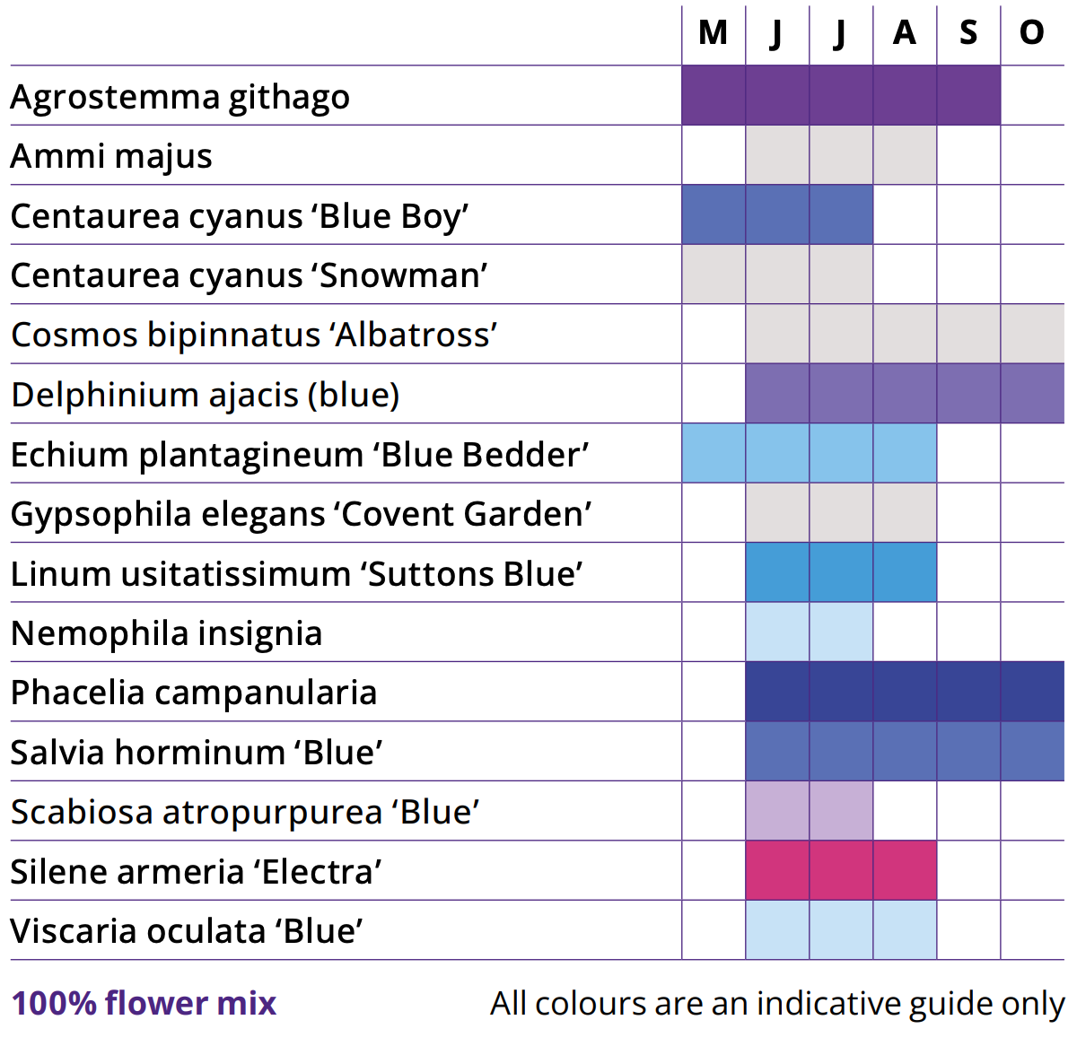 Restful and harmonious, this mix contains flowering meadow species of varied cool blues, whites, mauves and purple colours. Originally designed to represent the shimmering waters of the Olympic aquatic centre, the Aqua recipe has been further improved with careful adjustment to give even more visual impact. Aqua provides a tremendous, long season display which will create ever-changing seasonal interest with some further variations as autumn approaches.