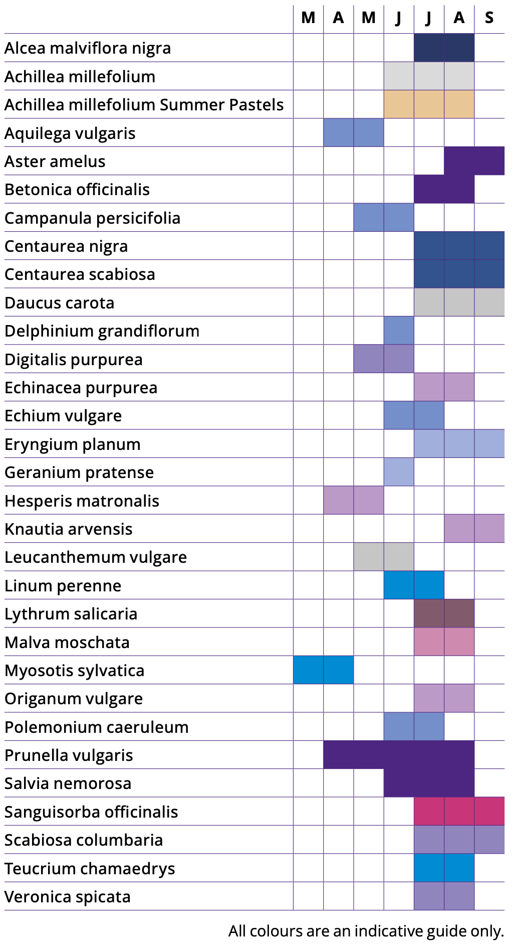 Robust and reliable, Purple Haze is noted for its cool and subtle colour palette of whites, blues and purples. This meadow turf is ideal for most landscape and garden situations, and is best suited for locations in full sun to light shade. Purple Haze thrives in normal fertility soils, and is able to tolerate drought stress and moderate seasonal waterlogging, making it ideal for Sustainable Urban Drainage Systems (SuDS). Purple Haze features 31 different flowering perennial species carefully formulated to create densities of over 150 plants per metre.